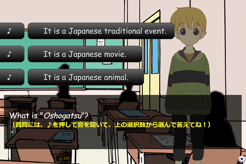 日本の文化を学びながら英語を学習するゲーム。クイズの選択肢には音声も録音しており、リスニング力も身につけることができる。”Play”と”Pray”などといった音声と綴りの違いを理解することを目標とした。