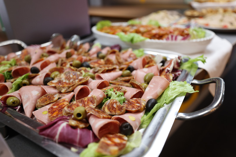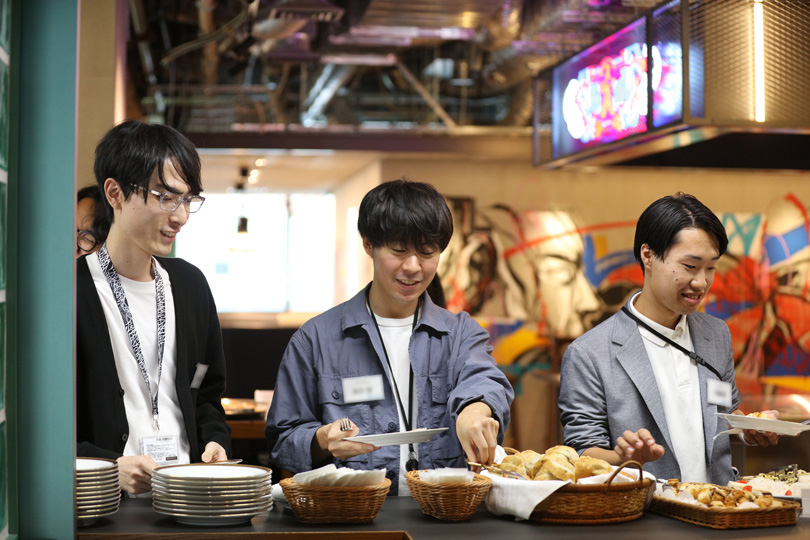 懇親会の前半は、テーブルごとにわかれて美味しく食事をいただきます!ブッフェ形式でお料理を取り、席に着いたら簡単に自己紹介。中には、既にグリーグループで内定者アルバイトをしていて顔見知りの方もいますが、今回が初の顔合わせの機会となる方も!