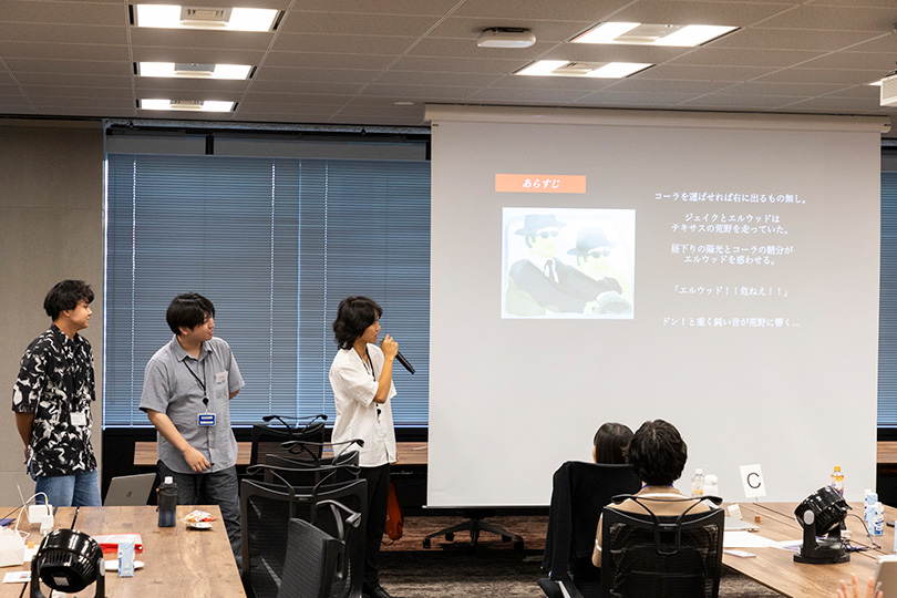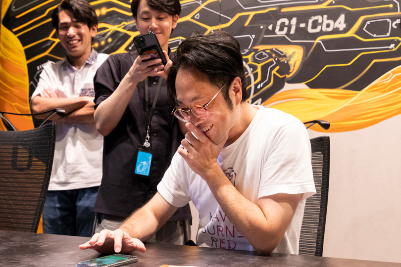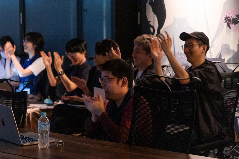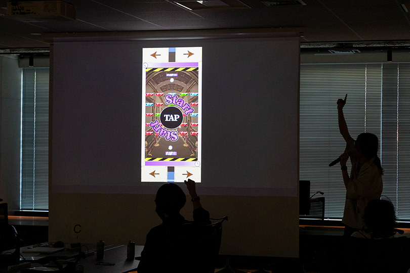 最終審査は、スマートフォンにビルドしたモックアップを全チーム分、審査員が初見でプレイして評価を決めていきます。審査員は、グリーエンタ―テインメント株式会社 代表取締役社長を務め、『ヘブンバーンズレッド』プロデューサー 通称「柿P」としても知られる柿沼さんです。