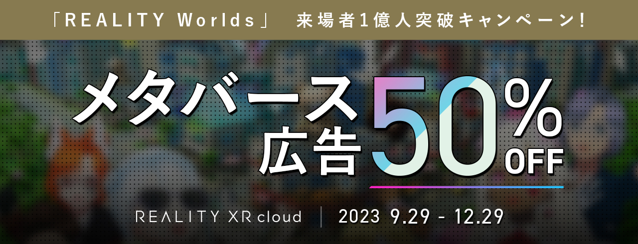 「REALITY Worlds」の累計来場者数1億人突破を記念して、2023年中にご成約いただいたお客様を対象に「REALITY Worlds」のメタバース広告が50%オフになるキャンペーンを実施します。この機会にぜひ下記URLからお問い合わせください。